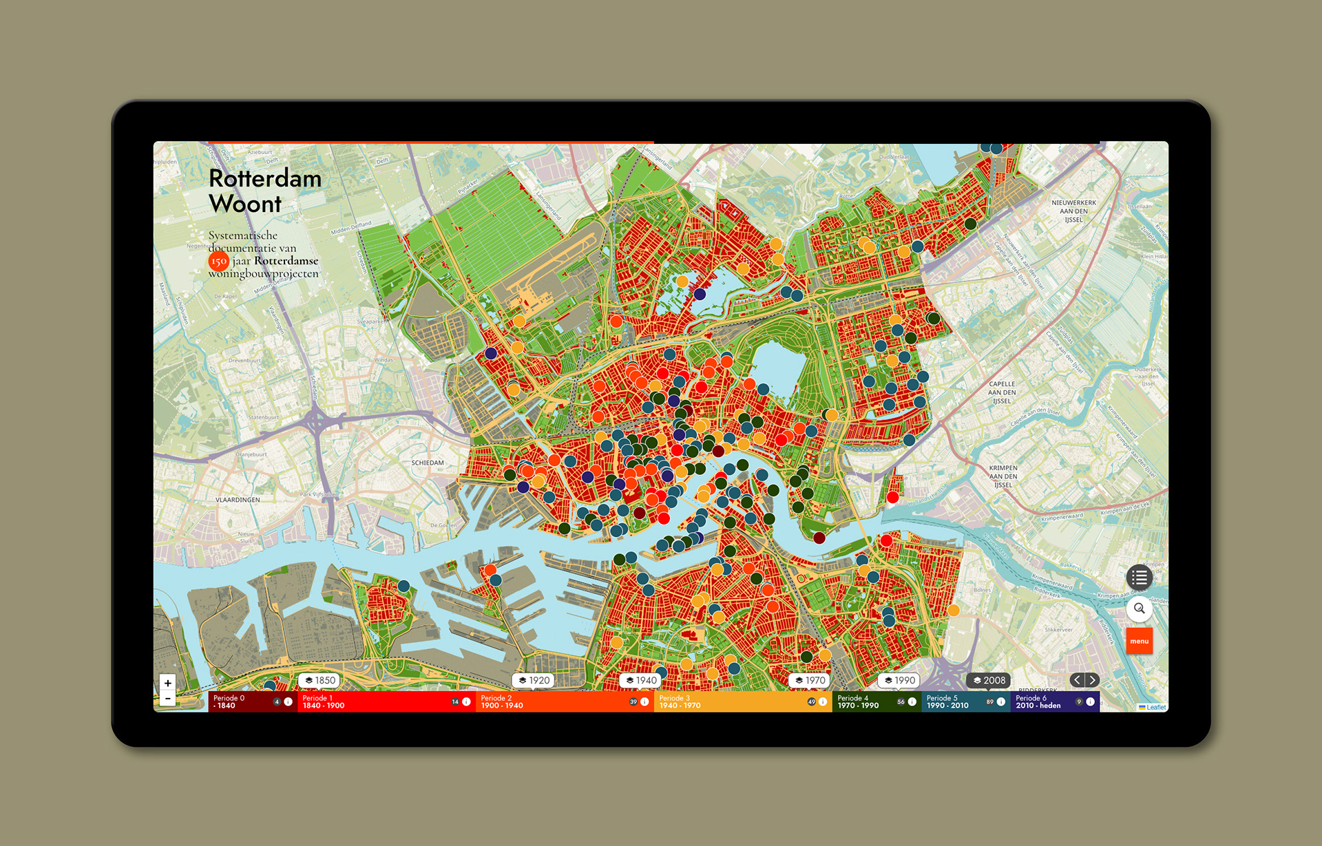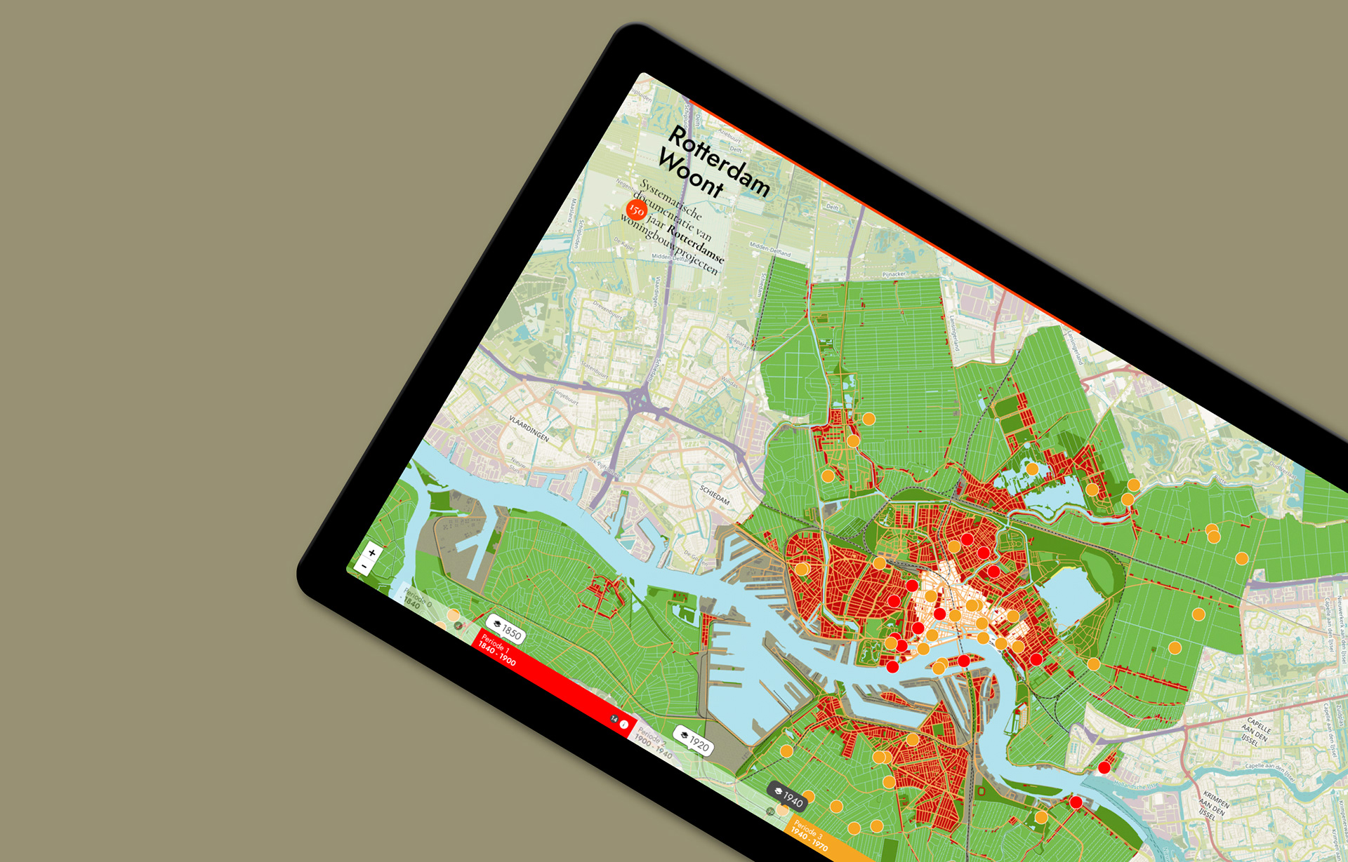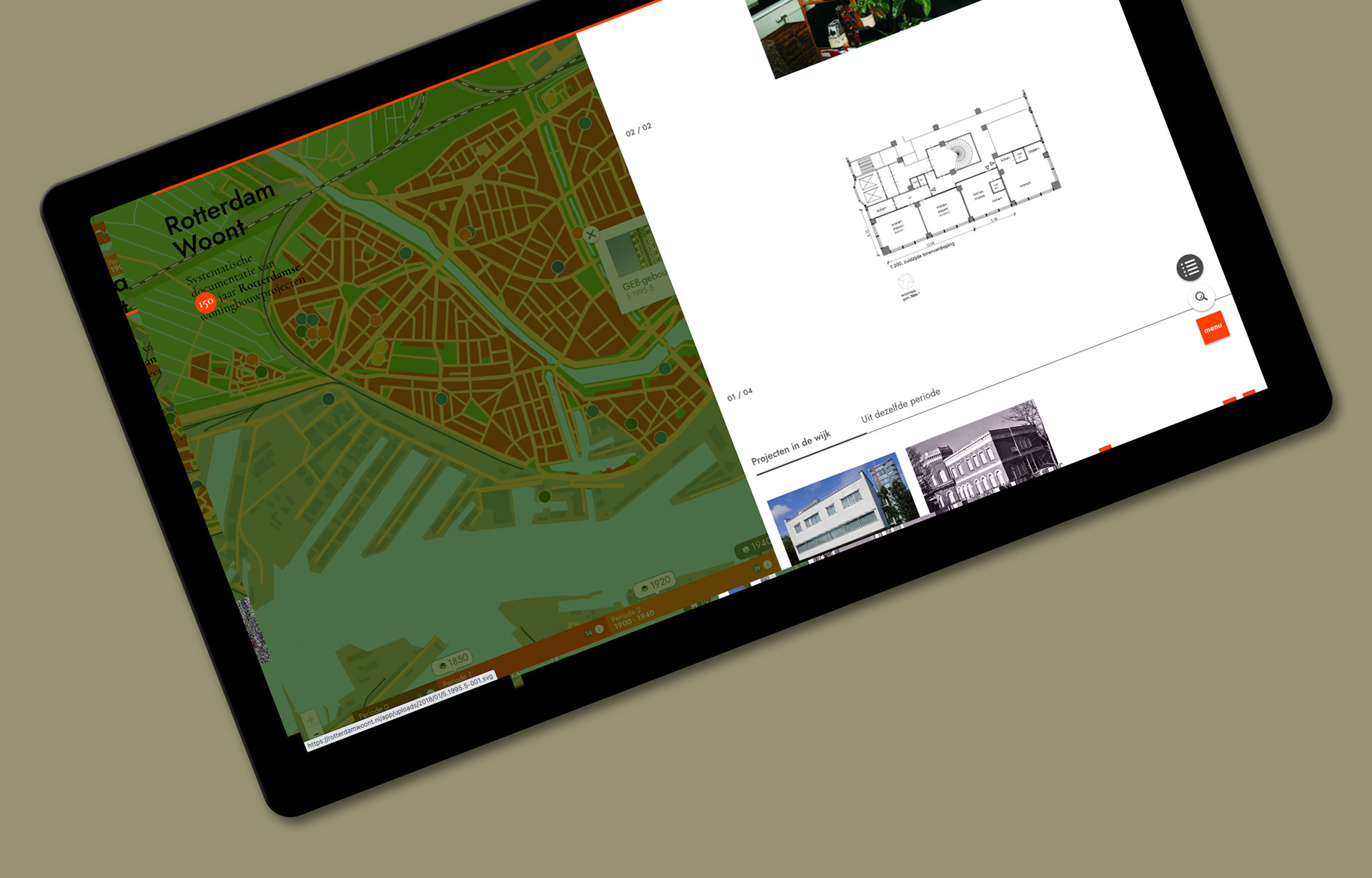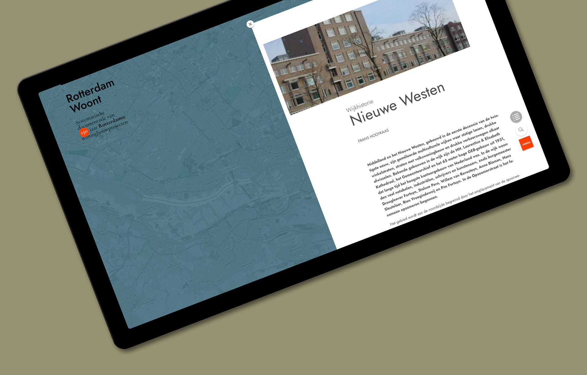 Rotterdam Woont wil voor de eerste keer een overzicht geven van de geschiedenis van het wonen in Rotterdam. Deze systematische documentatie dat als onderzoeksmateriaal dient voor studenten bouwkunde – van 150 jaar aan Rotterdamse woningbouwprojecten wordt actueel gehouden en digitaal ontsloten via dit platform. Het gaat in essentie om de woningplattegrond, die veel meer informatie prijsgeeft dan de gebruiksfunctie en het aantal vierkante meters. De basis van het platform wordt gevormd door een interactieve historische ‘groeikaart’ van de stad waarop alle woningbouwprojecten, onderverdeeld in verschillende (bouw)perioden zijn weergegeven. Door gebruik te maken van zoekopdrachten, filter-opties en thematische essays kan informatie over de woningen in deze atlas worden gevonden. Naast de woonatlas bevat de website bundelingen van bewonersverhalen, wijkgegevens, (bouw- en stads)geschiedenis en woningplattegronden waarmee de bezoeker gestimuleerd wordt om, met de mobiele versie van de website in de hand, de stad en woongeschiedenis te verkennen en te leren kennen.