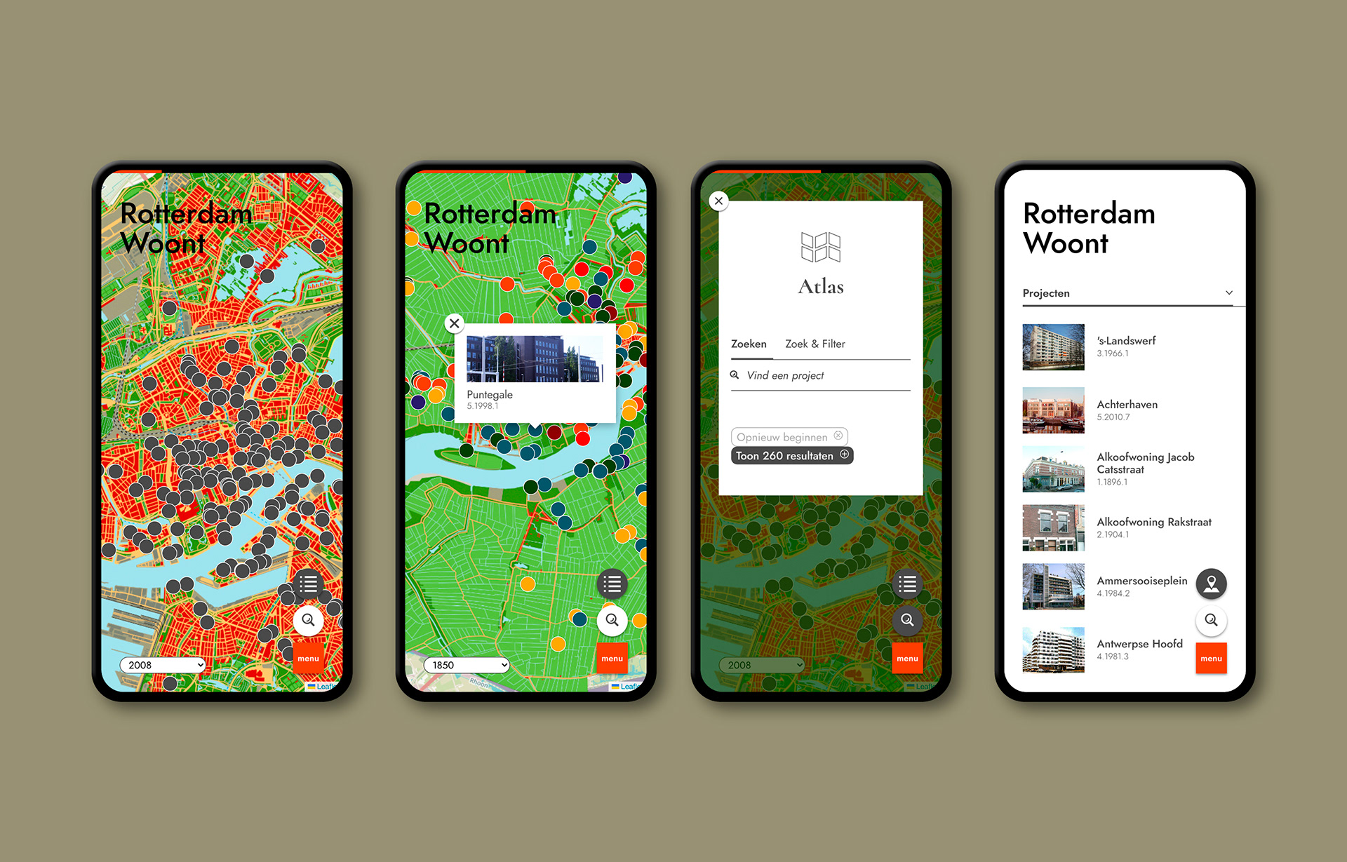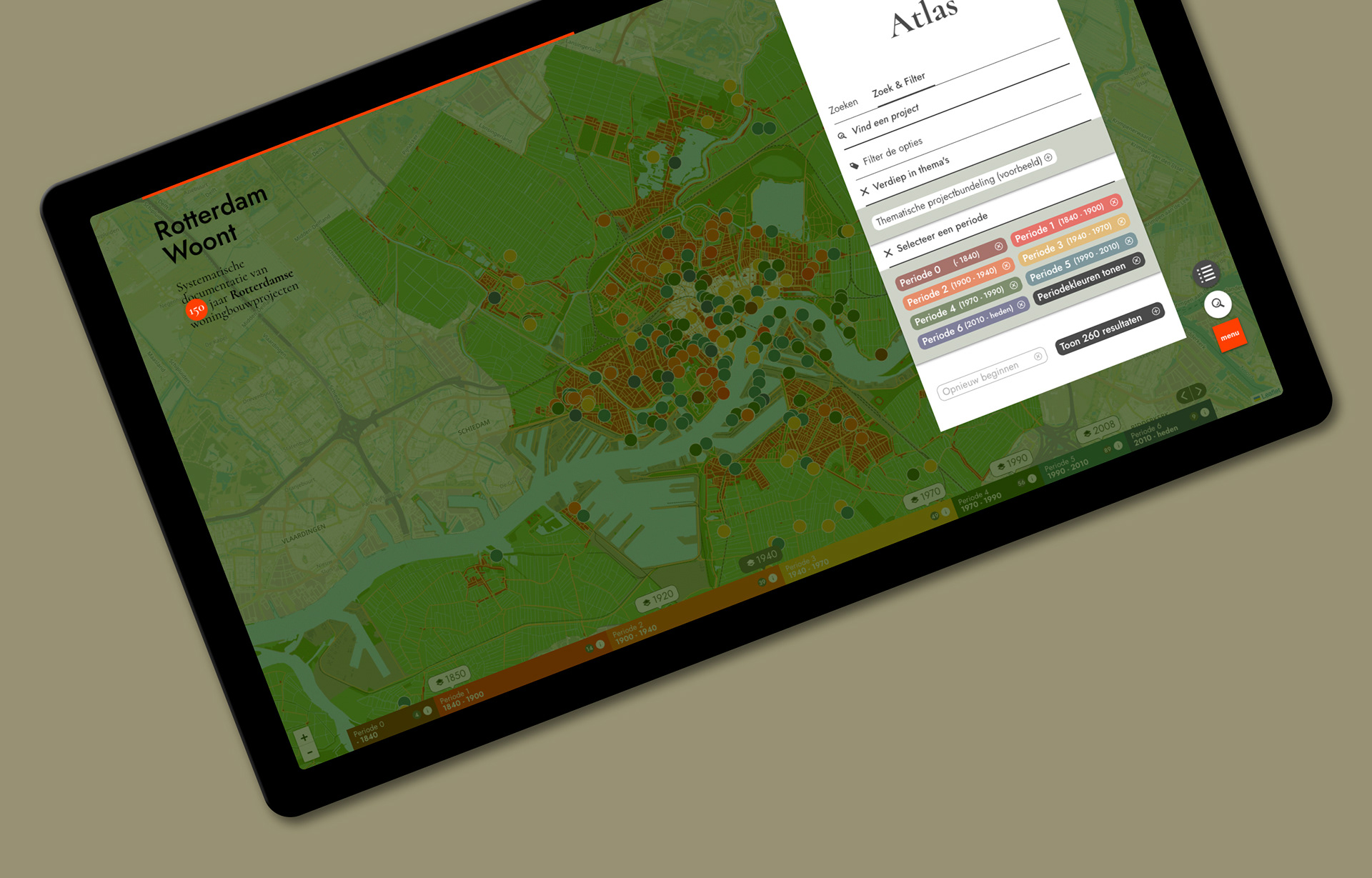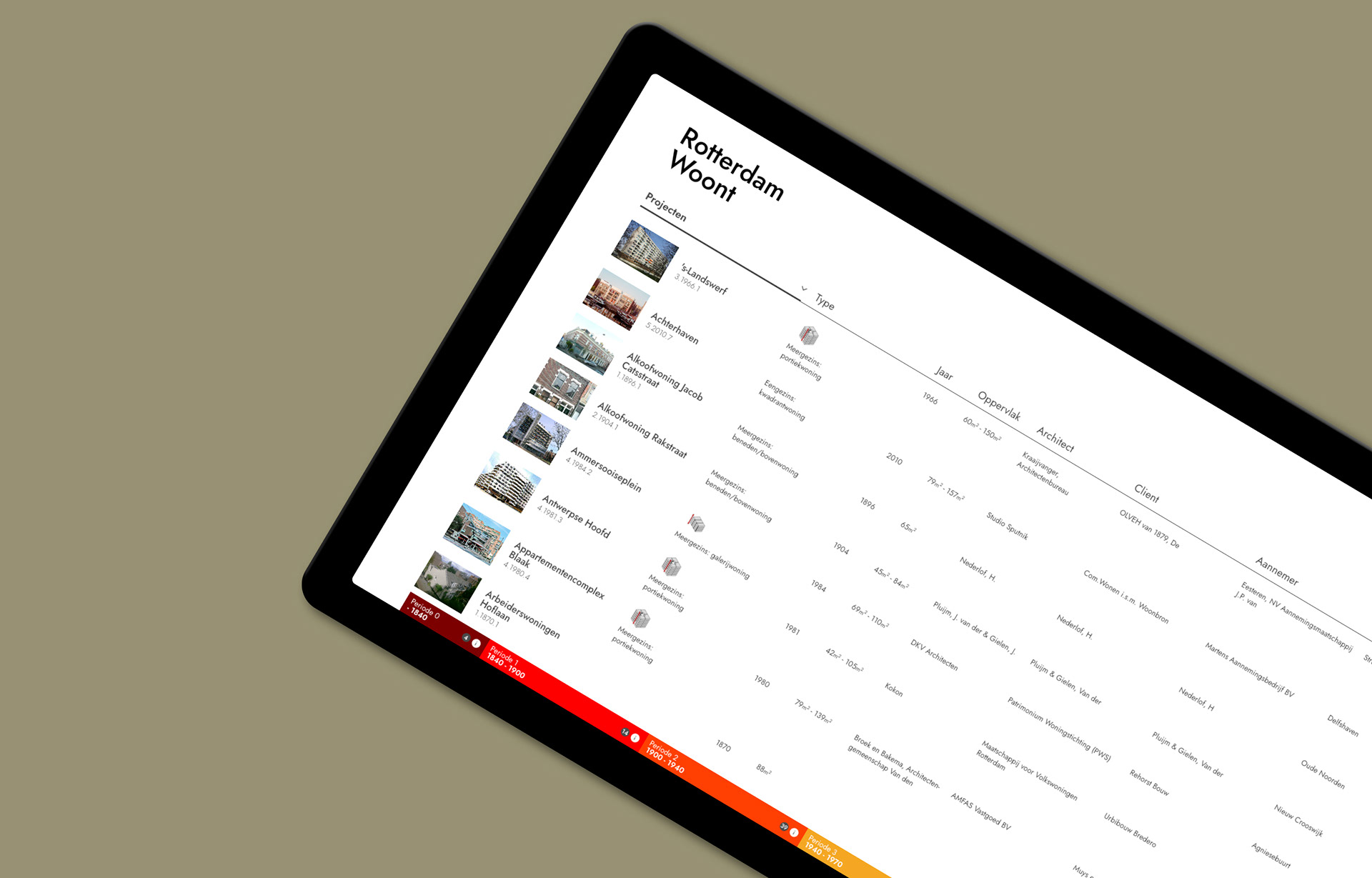 Rotterdam Woont wil voor de eerste keer een overzicht geven van de geschiedenis van het wonen in Rotterdam. Deze systematische documentatie dat als onderzoeksmateriaal dient voor studenten bouwkunde – van 150 jaar aan Rotterdamse woningbouwprojecten wordt actueel gehouden en digitaal ontsloten via dit platform. Het gaat in essentie om de woningplattegrond, die veel meer informatie prijsgeeft dan de gebruiksfunctie en het aantal vierkante meters. De basis van het platform wordt gevormd door een interactieve historische ‘groeikaart’ van de stad waarop alle woningbouwprojecten, onderverdeeld in verschillende (bouw)perioden zijn weergegeven. Door gebruik te maken van zoekopdrachten, filter-opties en thematische essays kan informatie over de woningen in deze atlas worden gevonden. Naast de woonatlas bevat de website bundelingen van bewonersverhalen, wijkgegevens, (bouw- en stads)geschiedenis en woningplattegronden waarmee de bezoeker gestimuleerd wordt om, met de mobiele versie van de website in de hand, de stad en woongeschiedenis te verkennen en te leren kennen.