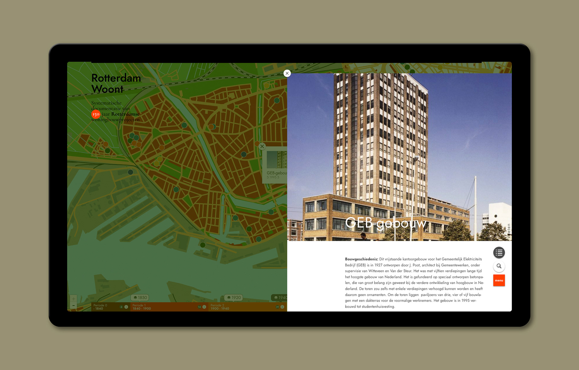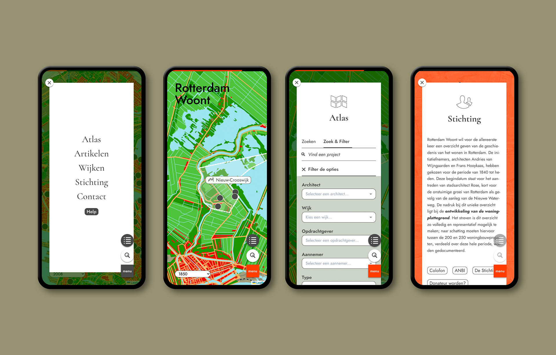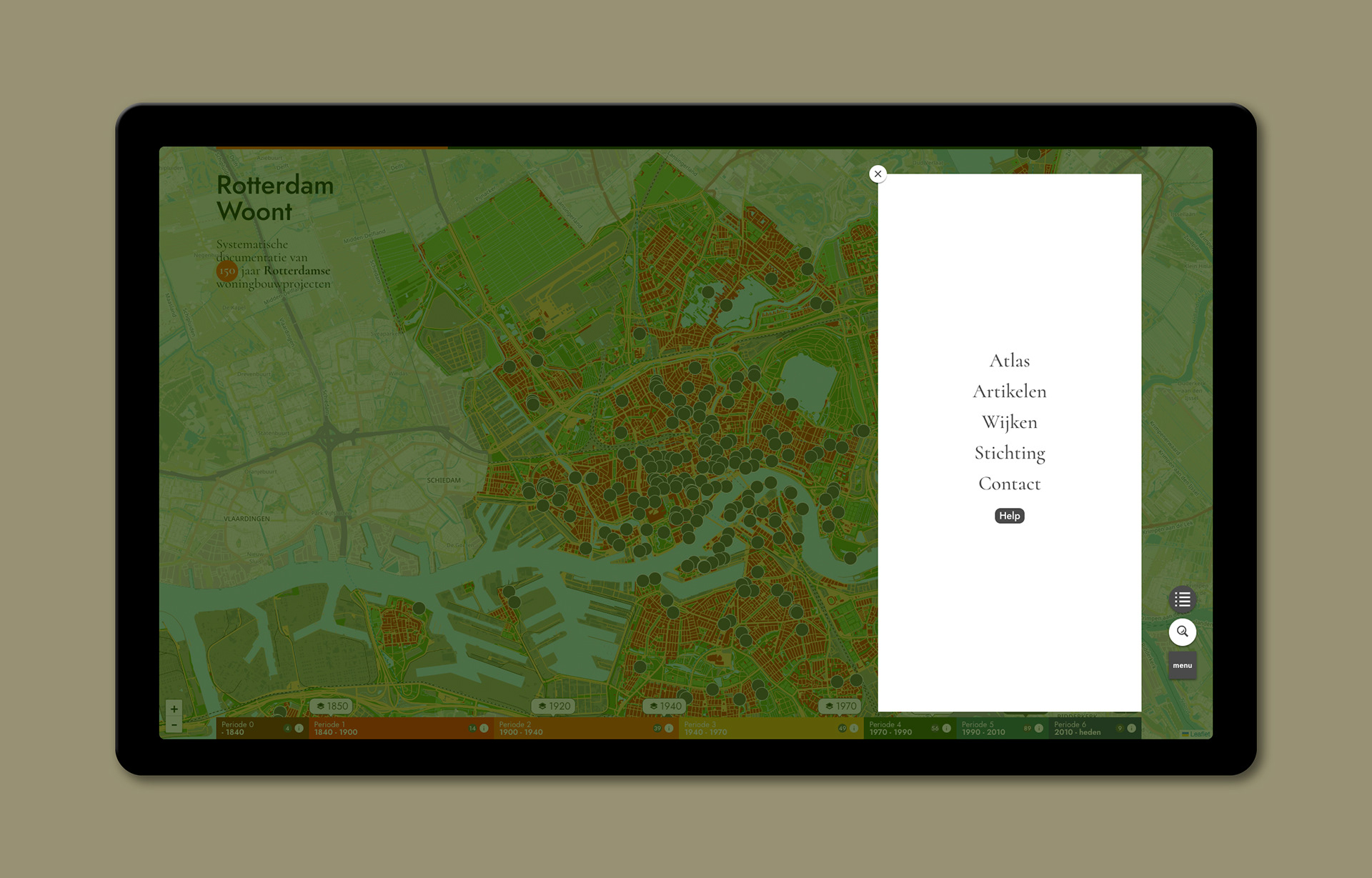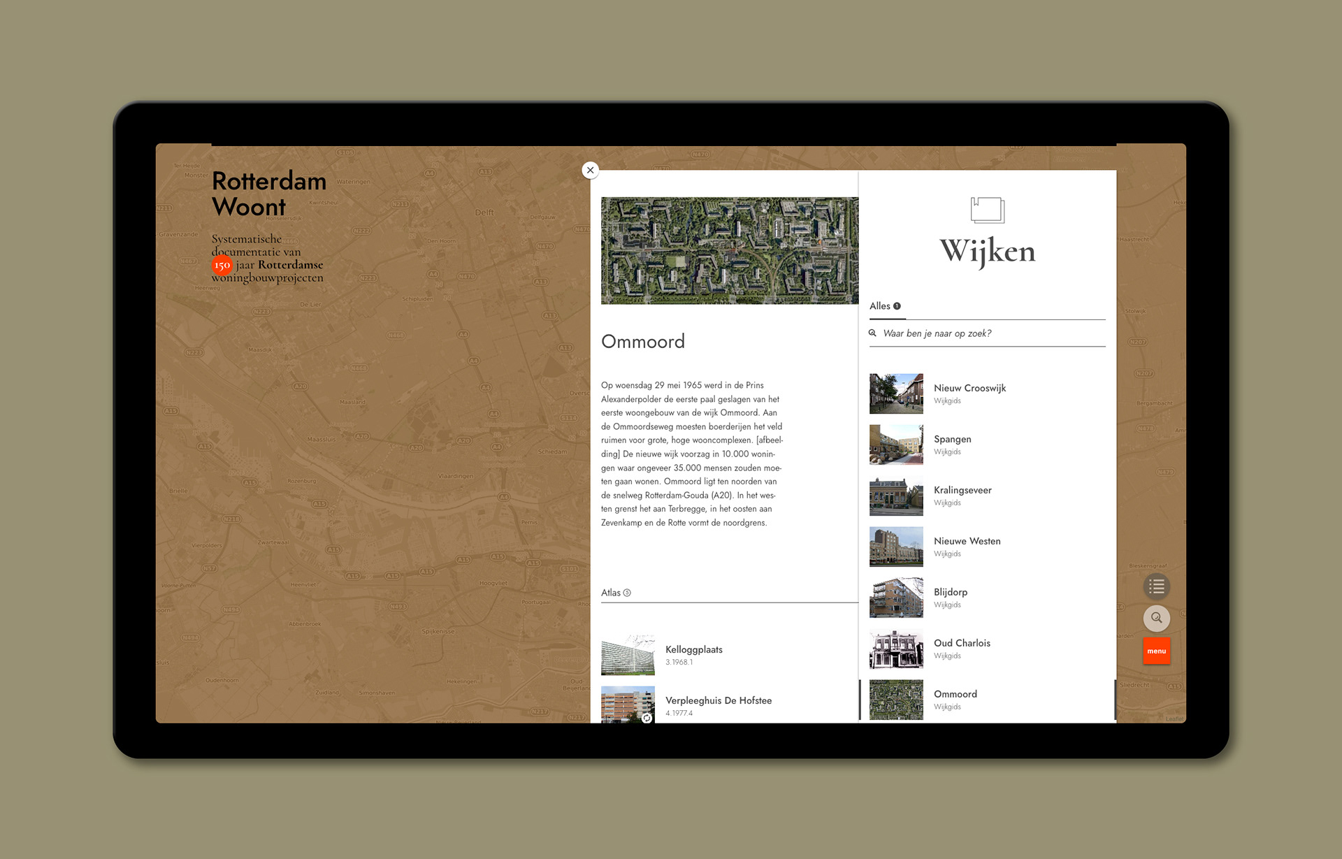 Rotterdam Woont wil voor de eerste keer een overzicht geven van de geschiedenis van het wonen in Rotterdam. Deze systematische documentatie dat als onderzoeksmateriaal dient voor studenten bouwkunde – van 150 jaar aan Rotterdamse woningbouwprojecten wordt actueel gehouden en digitaal ontsloten via dit platform. Het gaat in essentie om de woningplattegrond, die veel meer informatie prijsgeeft dan de gebruiksfunctie en het aantal vierkante meters. De basis van het platform wordt gevormd door een interactieve historische ‘groeikaart’ van de stad waarop alle woningbouwprojecten, onderverdeeld in verschillende (bouw)perioden zijn weergegeven. Door gebruik te maken van zoekopdrachten, filter-opties en thematische essays kan informatie over de woningen in deze atlas worden gevonden. Naast de woonatlas bevat de website bundelingen van bewonersverhalen, wijkgegevens, (bouw- en stads)geschiedenis en woningplattegronden waarmee de bezoeker gestimuleerd wordt om, met de mobiele versie van de website in de hand, de stad en woongeschiedenis te verkennen en te leren kennen.