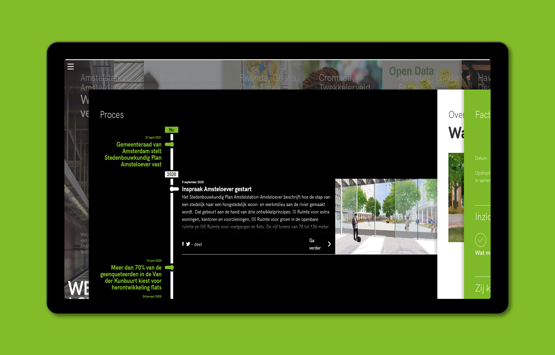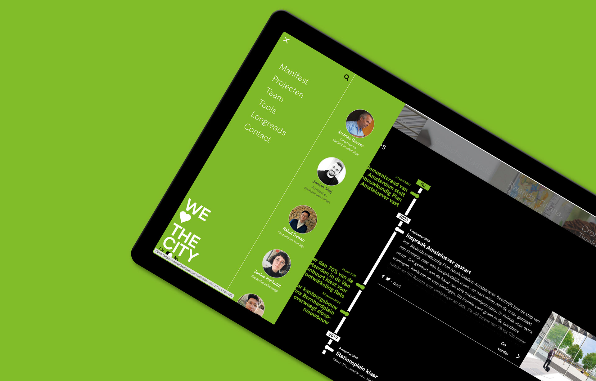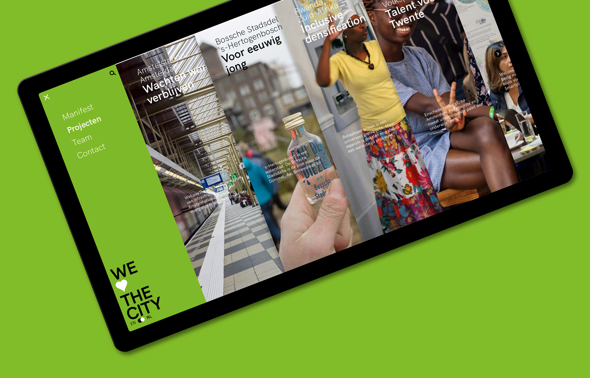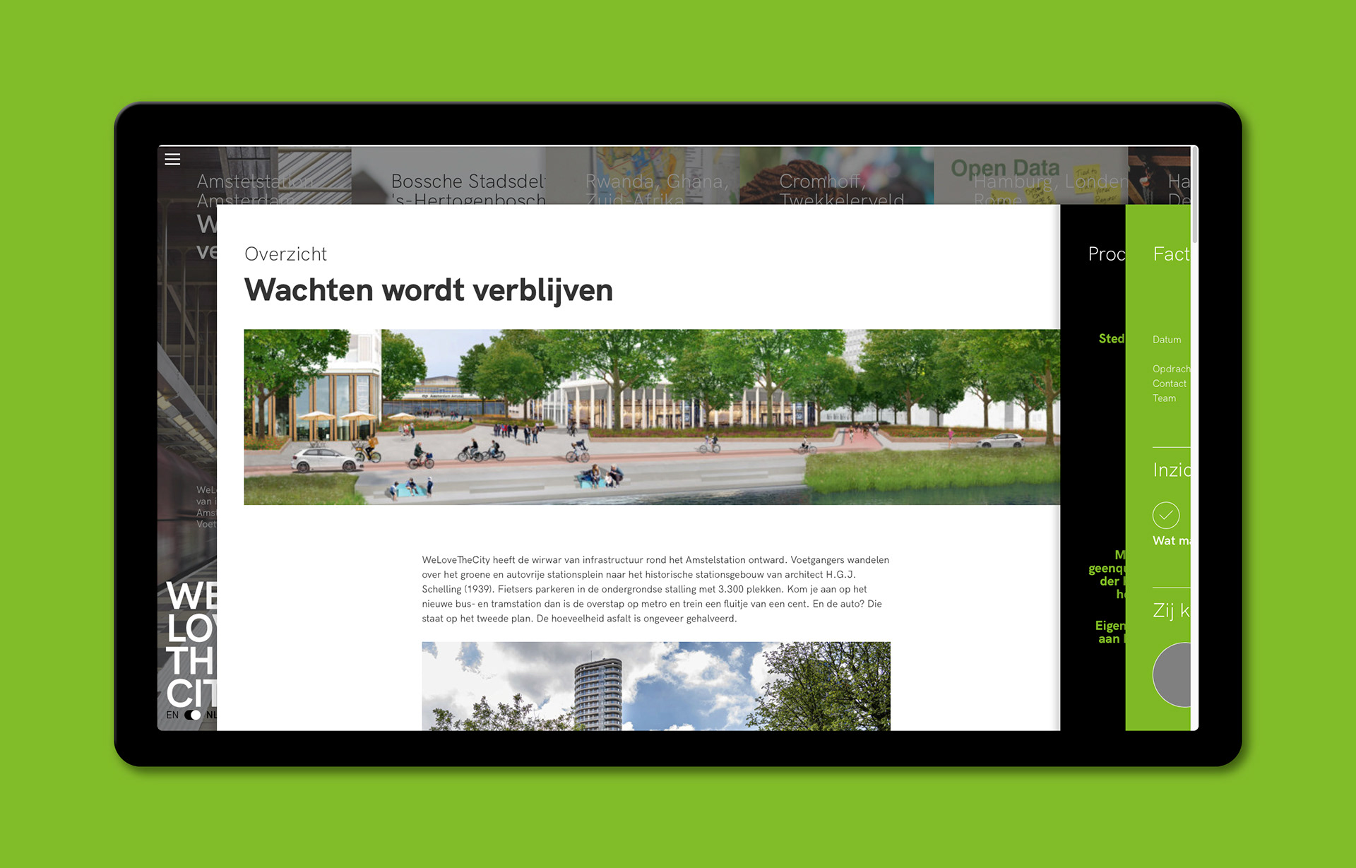 We hebben de essentie van de werkwijze van stedenbouwkundig bureau WeLoveTheCity welovethecity.eu gevat in het functionele en visuele ontwerp van hun website. Daarbij staan (burger)participatie middels cocreatie, transparantie door kennisdeling en langdurige betrokkenheid centraal. In het ontwerp is dat vertaald naar een website waarin de projecten weliswaar de kern vormen, maar de aandacht gaat niet alleen naar het eindresultaat. Door het portfolio op te splitsen in secties, geven we middels een dynamische tijdlijn de ruimte aan verslaglegging van het proces van totstandkoming. Er wordt inzicht geboden in toegepaste werkwijzen en bevindingen die voortkomen uit het cocreatieve ontwikkelingsproces worden gedeeld zodat derden wat kunnen met de resultaten. Deze transparante en participatieve manier van werken is ook in de visuele gelaagdheid van het ontwerp van de website tot uitdrukking gekomen waarmee recht wordt gedaan aan de complexiteit en omvangrijkheid van de projecten van het bureau.